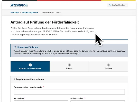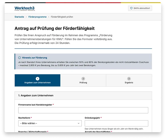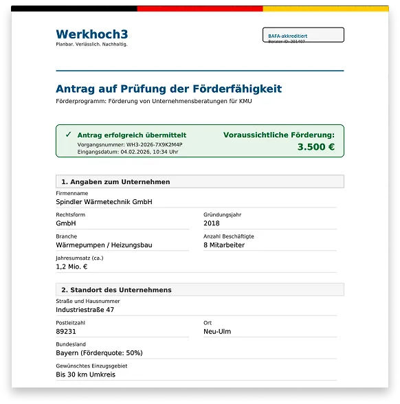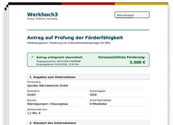Ja. Werkhoch3 ist offiziell beim BAFA (Bundesamt für Wirtschaft und Ausfuhrkontrolle) gelistet. Die Förderung ist ein bestehendes Bundesprogramm – kein Sonderangebot. Unser internes Förder-Team übernimmt den kompletten Antrag für Sie und stellt sicher, dass alle Voraussetzungen erfüllt sind, bevor wir starten.