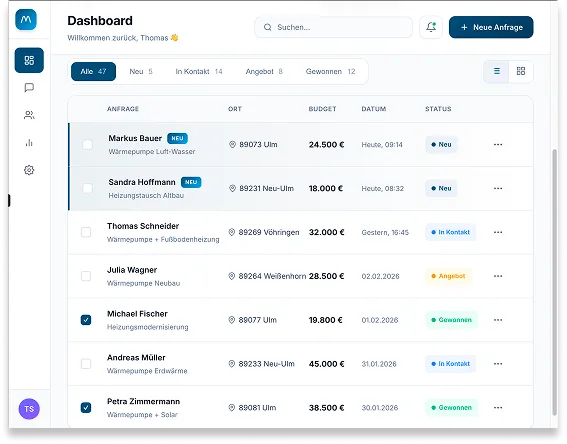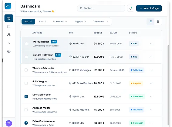Das System ist für etablierte Handwerksbetriebe mit mindestens 5 Mitarbeitern konzipiert – insbesondere in den Bereichen Photovoltaik, SHK (Sanitär/Heizung/Klima), Terrassenbau, Fenster & Türen, Dachsanierungen sowie Smart Home. Wichtig: Ihr Betrieb sollte Kapazitäten für Wachstum haben und einen durchschnittlichen Auftragswert von mindestens 5.000€ erzielen.